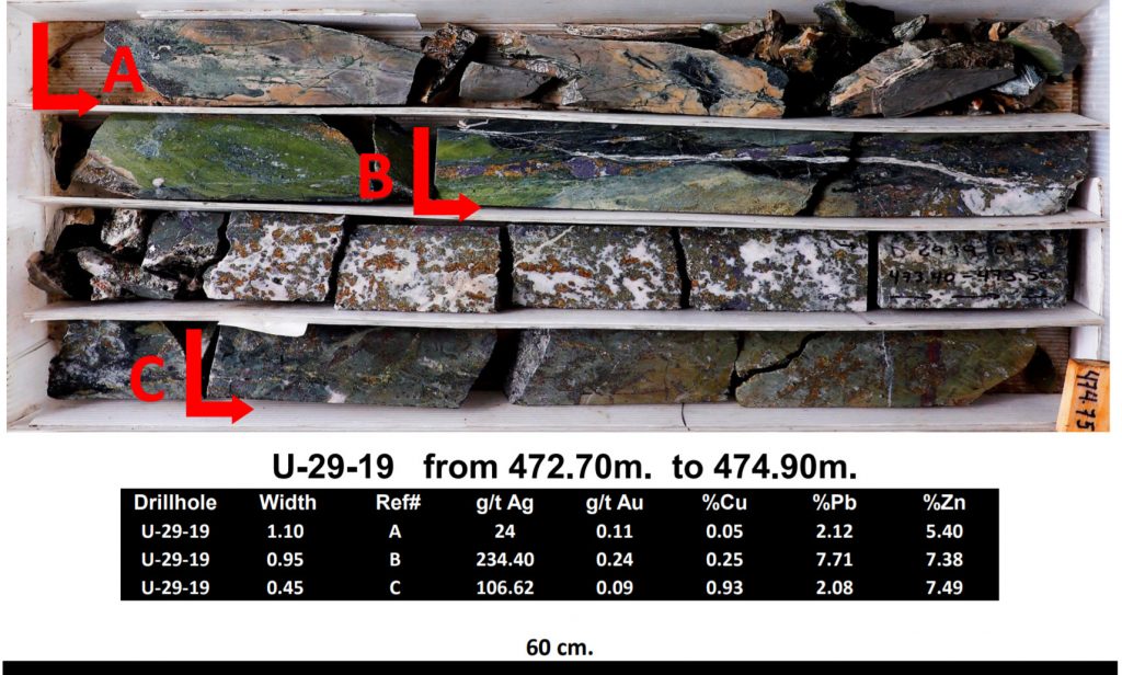 - Initial laboratory bench-scale metallurgical testing of individual diamond drill core composite samples indicates encouraging selective polymetallic flotation recoveries generating high quality silver-rich copper, lead and zinc mineral concentrates.