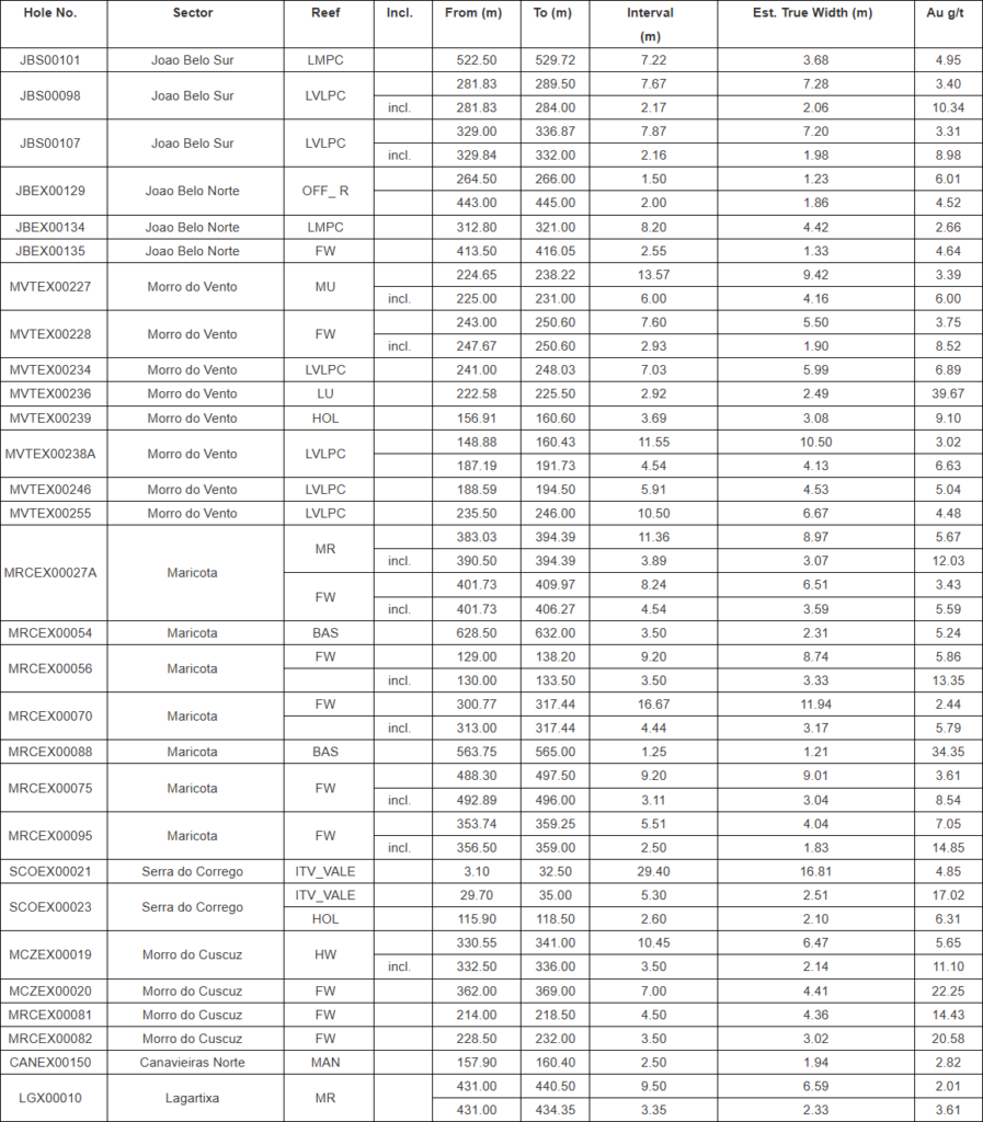 - At the Serra do Corrego deposit, infill drilling returned positive results, including: 16.81m @ 4.85 g/t Au (SCOEX00021); 2.10m @ 6.31 g/t Au and 2.51m @ 17.02 g/t Au (SCOEX00023).