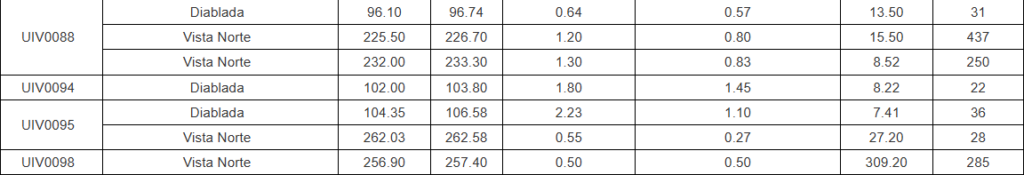 - Exploration and infill drilling in the central core mine area yielded strong results from principal and secondary structures. Highlights at Vista Norte and Diablada include: 0.80m @ 15.50 g/t Au, 437 g/t Ag (Vista Norte), 0.57m @ 13.50 g/t Au, 31 g/t Ag (Diablada) and 0.83m @ 8.52 g/t Au, 250 g/t Ag (Vista Norte) (UIV0088); 0.50m @ 309.20 g/t Au, 285 g/t Ag (UIV0098 – Vista Norte); 1.20m @ 8.46 g/t Au, 34 g/t Ag (UEV0043 – Vista Norte); 1.45m @ 8.22 g/t Au, 22 g/t Ag (UIV0094 – Diablada); and at Dorada FW: 0.44m @ 22.40 g/t Au, 370 g/t Ag (UED0082); 0.83m @ 116.49 g/t Au, 230 g/t Ag and 0.69m @ 9.70 g/t Au, 101 g/t Ag (UED0083). These results highlight the potential for secondary structures at the main core mine structures to add mineral resources near existing mine infrastructure.