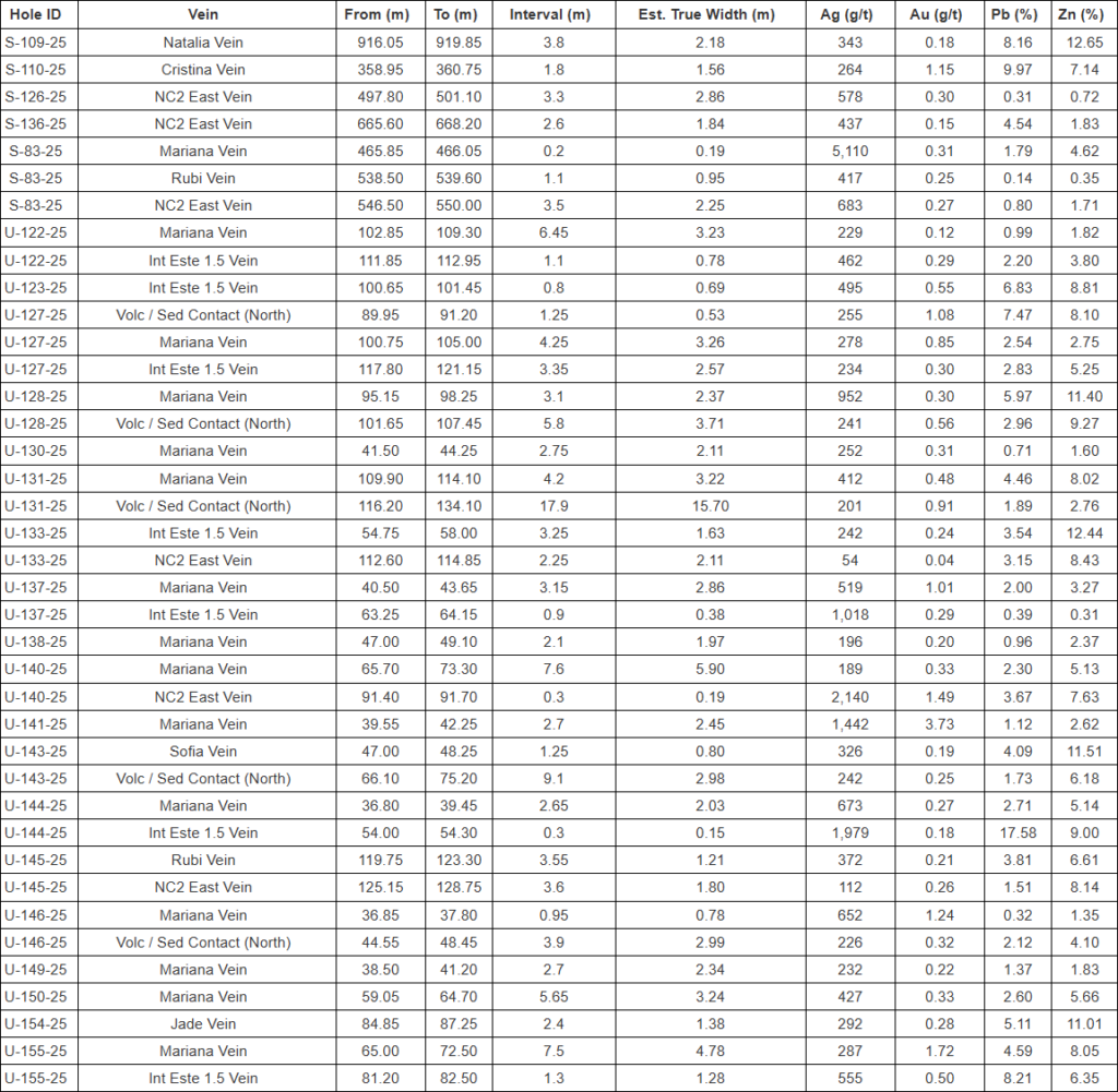 - Exploration and infill drilling on the east extension of the Mariana vein continue to return strong results from both the main and footwall splay structures. Highlights include: 2.45m @ 1,442 g/t Ag, 3.73 g/t Au, 1.12% Pb, 2.62% Zn (U-141-25), 2.37m @ 952 g/t Ag, 0.30 g/t Au, 5.97% Pb, 11.40% Zn (U-128-25), 2.86m @ 519 g/t Ag, 1.01 g/t Au, 2.00% Pb, 3.27% Zn (U-137-25) and 2.03m @ 673 g/t Ag, 0.27 g/t Au, 2.71% Pb, 5.14% Zn (U-144-25).