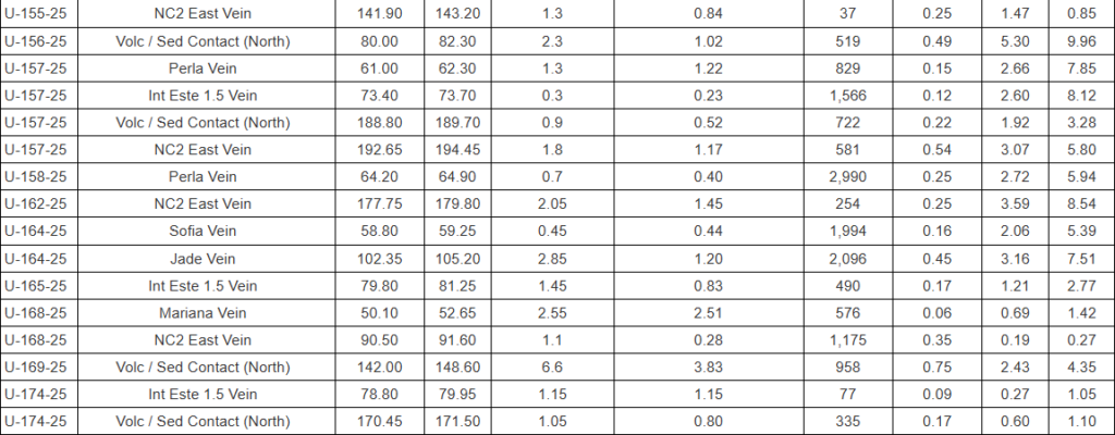 - Intermedia Este 1.5 vein: 0.38m @ 1,018 g/t Ag, 0.29 g/t Au, 0.39% Pb, 0.31% Zn (U-137-25) and 0.69m @ 495 g/t Ag, 0.55 g/t Au, 6.83% Pb, 8.81% Zn (U-123-25).
