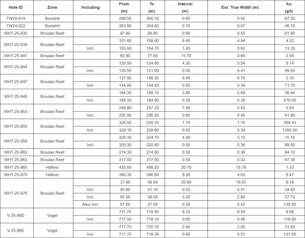 - 0.55m @ 61.80 g/t Au (drill hole WHT-25-835), 4.94m @ 4.32 g/t Au, incl. 0.93m @ 13.33 g/t Au (WHT-25-839), 2.89m @ 36.44 g/t Au incl. 0.38m @ 270 g/t Au (WHT-25-848), 1.15m @ 399.43 g/t Au incl. 0.34m @ 1350.00 g/t Au (WHT-25-855)