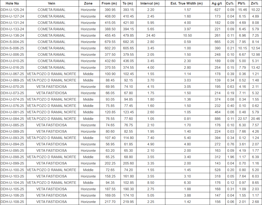 - High-grade polymetallic mineralization within the Cometa Ramal vein (Horizonte zone) was extended 200 metres along strike and 300 metres to depth with 22 drillholes. The zone remains open at depth to the east. Results include: 1.57m @ 627 g/t Ag, 0.09% Cu, 15.46% Pb, 10.22% Zn (U-125-24), 10.50m @ 261 g/t Ag, 0.11% Cu, 6.96% Pb, 7.25% Zn (U-136-24), and 4.00m @ 182 g/t Ag, 0.09% Cu, 4.69% Pb, 8.08% Zn (U-131-24).