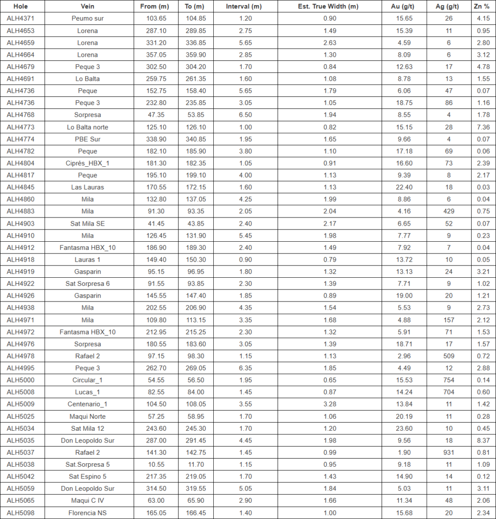 - Minera Florida – infill and exploration drilling within the main mine area, encompassing over 50 economically important structures associated with five primary district trends, continue to extend mineralization beyond the current inferred mineral resources, underscoring the potential to extend mine life. Drill highlights include: 1.06m @ 20.19 g/t Au, 11 g/t Ag, 0.28% Zn (ALH5025-Maqui Norte); 1.2m @ 23.60 g/t Au, 10 g/t Ag, 0.45% Zn (ALH 5034 – Sat Mila 12); 1.13m @ 22.4 g/t Au, 18 g/t Ag, 0.03% Zn (ALH 4845 – Las Lauras); 1.39m @ 18.71 g/t Au, 17 g/t Ag, 1.57% Zn (ALH4976 – Sorpresa); 1.05m @ 18.75 g/t Au, 86 g/t Ag, 1.16% Zn (ALH 4736 – Peque 3); and 1.49m @ 15.39 g/t Au, 11 g/t Ag, 0.95% Zn (ALH4653-Lorena).