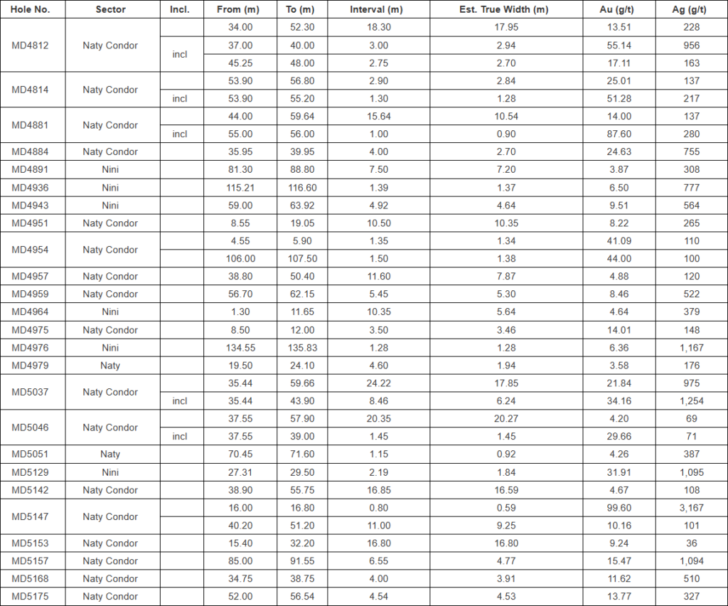 - Naty Condor, discovered in late 2023 with initial drilling in mid-2024, features mineralization along an approximately 700 metre long northwest-trending corridor, delineated to depths of 50 to 90 metres below surface within multiple coalescing structures that form wide, often high-grade zones. Mineralization is hosted by and proximal with the contact between bedded sedimentary strata and felsic volcaniclastic rocks. Mineralization remains partially open to depth and along strike to the northwest and southeast. Notable intercepts include: 17.95m @ 13.51 g/t Au, 228 g/t Ag, incl. 2.94m @ 55.14 g/t Au, 956 g/t Ag (MD4812); 10.35m @ 8.22 g/t Au, 265 g/t Ag (MD4951); 16.80m @ 9.24 g/t Au, 36 g/t Ag (MD5153); 0.59m @ 99.60 g/t Au, 3,167 g/t Ag and 9.25m @ 10.16 g/t Au, 101 g/t Ag (MD5147); 10.54m @ 14.00 g/t Au, 137 g/t Ag, incl. 0.90m @ 87.60 g/t Au, 280 g/t Ag (MD4881); 20.27m @ 4.20 g/t Au, 69 g/t Ag, incl. 1.45m @ 29.66 g/t Au, 71 g/t Ag (MD5046); and 17.85m @ 21.84 g/t Au, 975 g/t Ag, incl. 6.24m @ 34.16 g/t Au, 1,254 g/t Ag (MD5037).