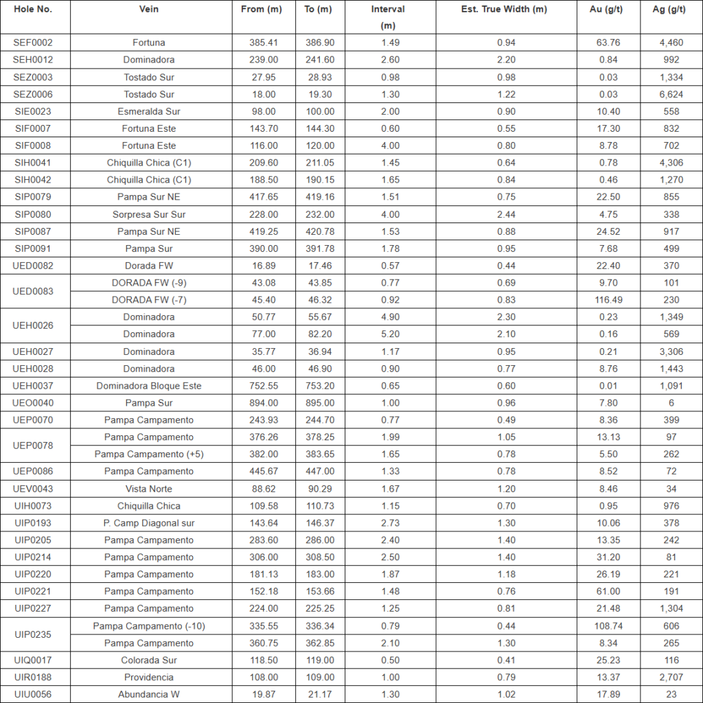 - Drilling at Pampa Campamento within the intrusive and lower andesite sequence continues to confirm and extend mineralization to depth and north toward the Magenta vein. Infill drill highlights include: 1.40m @ 31.20 g/t Au, 81 g/t Ag (UIP0214); 0.76m @ 61.00 g/t Au, 191g/t Ag (UIP0221); 1.18m @ 26.19 g/t Au, 221 g/t Ag (UIP0220); 1.30m @ 8.34 g/t Au, 265 g/t Ag and 0.44m @ 108.74 g/t Au, 606 g/t Ag (-10 splay) (UIP0235). At the adjacent Pampa Campamento Diagonal Sur splay vein, infill drilling returned 1.30m @ 10.06 g/t Au, 378 g/t Ag (UIP0193). Mineralization within the lower andesite unit now extends more than 200 metres below the rhyolite contact, underscoring the mineral potential of this underexplored stratigraphic level across the mine. Exploration drilling highlights at Pampa Campamento include: UEP0078, with 1.05m @ 13.13 g/t Au, 97 g/t Ag and 0.78m @ 5.50 g/t Au, 262 g/t Ag (+5 splay); UEP0070, with 0.49m @ 8.36 g/t Au, 399 g/t Ag; and UEP0086, with 0.78m @ 8.52 g/t Au, 72 g/t Ag. Mineralization at Pampa Campamento now spans nearly 800 metres vertically. The implications of these deeper results are under evaluation and may suggest mineralization potential at greater depths in other veins.