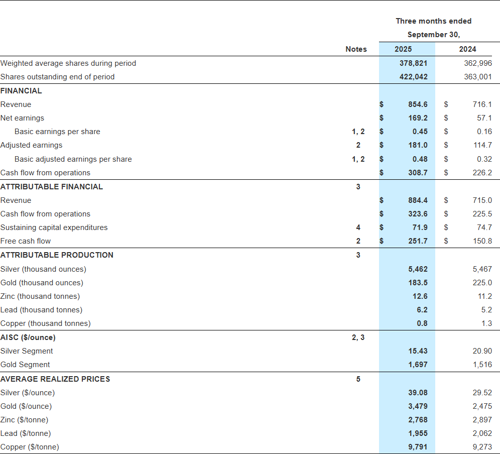 - Net earnings of $169.2 million, or $0.45 basic earnings per share. Net earnings include a $21.7 million loss from the sale of subsidiaries and $16.3 million of income from investment in Juanicipio. The loss from the sale of subsidiaries is primarily due to a $28.6 million reduction to the $137.4 million gain previously booked on the December 2024 sale of La Arena S.A. related to net working capital adjustments, partially offset by a $6.8 million gain on the sale of the La Pepa project. The Company disposed of its 80% interest in the La Pepa project, an early-stage exploration property in Chile, for $40.0 million in net cash proceeds in Q3 2025.