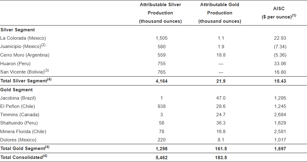- References to “Attributable” refer to the Company’s ownership share of results, which includes results from the operations that the Company has a 100% ownership interest in as well as from the operations, specifically Juanicipio and San Vicente, that the Company does not own a 100% interest in.