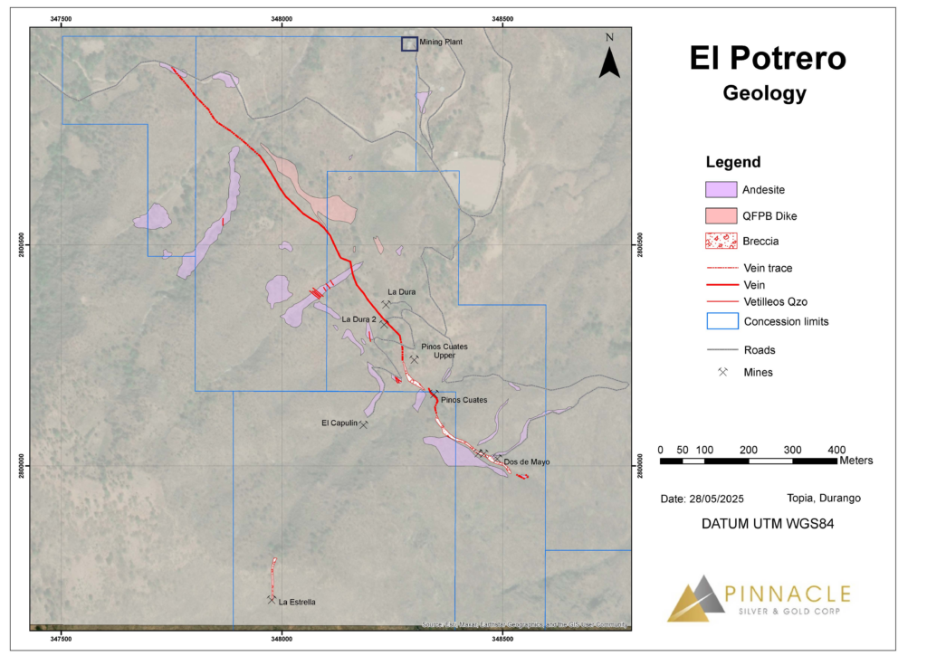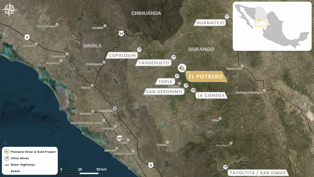 VANCOUVER, BRITISH COLUMBIA – TheNewswire – June 25, 2025 (TSXV: PINN, OTC: NRGOF, Frankfurt: P9J) – Pinnacle Silver and Gold Corp. (“Pinnacle” or the “Company“) is pleased to provide an update on the high-grade Potrero gold-silver property in Durango, Mexico (see Figure 1). While surface and underground mapping and sampling continues, a recent site visit was conducted for consultants to assess the condition of the processing plant and provide guidance on potential permitting procedures.