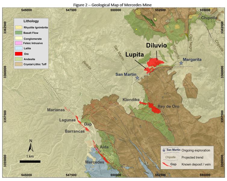 - New mineralized veins confirmed at San Martin opening the area 600 m to the west of the Lupita deposit with high potential for future discoveries (Figure 1)