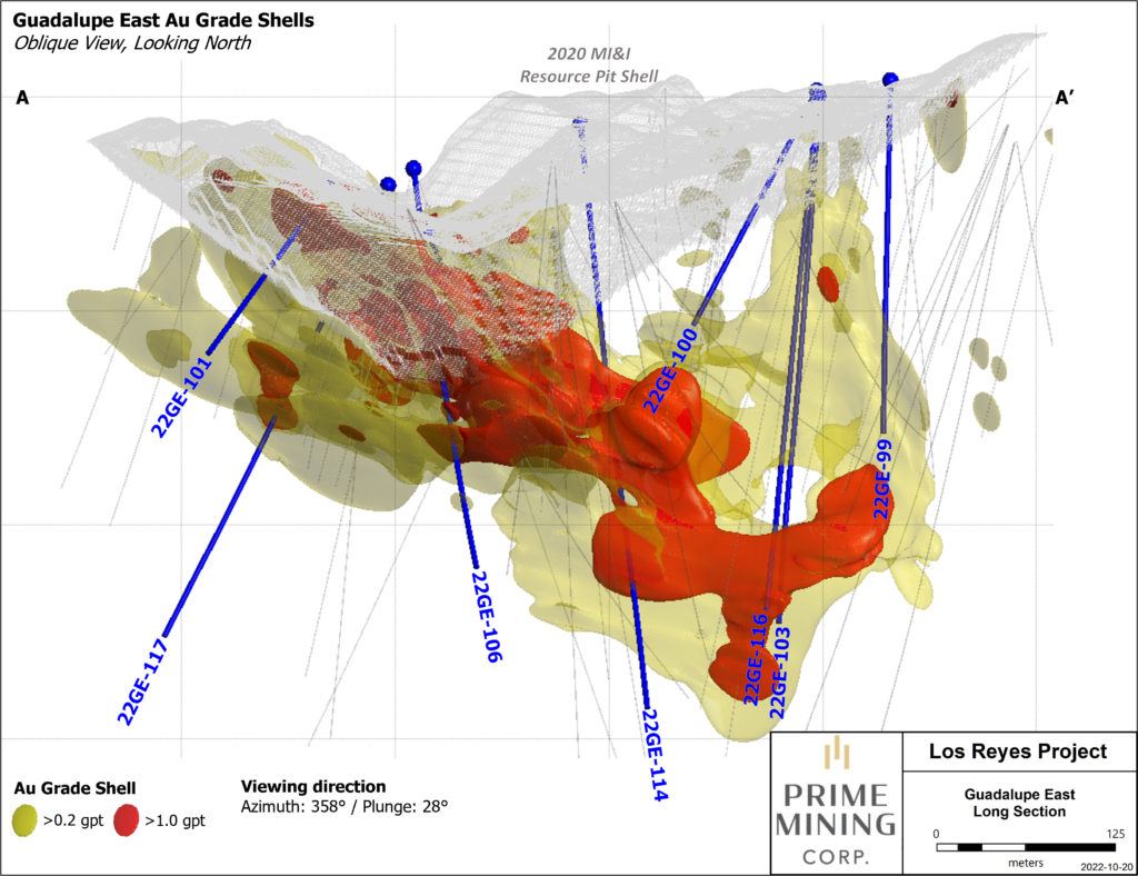In addition to the significant intercepts shown above, Prime has released the full current assay table for the Guadalupe area (Link 2 above). While some of the holes included in that table are more exploratory in nature, holes targeting the key mineralized vein structures in Guadalupe continue to indicate potential high-grade, high-margin resource expanding ounces characteristic of the Guadalupe area. Included in these results are intersections of various structures, including previous underground workings. Where previous workings or stopes have encountered what has been interpreted as backfill material, these segments have been included in the table and identified as such in the ‘Vein’ column. While some of this material is mineralized and high-grade (for example, 7.1 g/t Au, 1,040 g/t Ag over 0.8 m and 6.4 g/t Au, 855 g/t Ag over 0.6 m in hole 22GE-116), it will be excluded from future reported resource inventories and will not influence interpolated resource block grades. Highlights and significant intercepts shown above only include what has been interpreted as in situ material, and do not include any assayed backfill material.