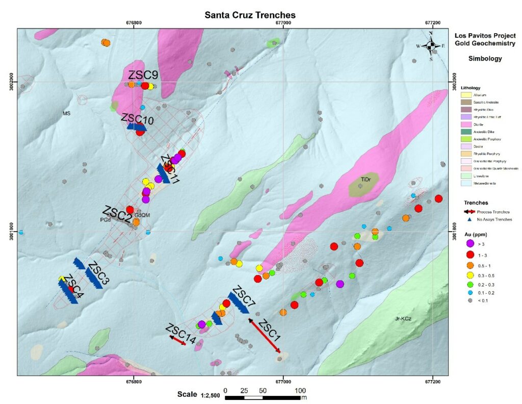 “We are excited by theresults of our recent sampling program at Los Pavitos. Initial results from trenches provide the first indication that wider zones of low-grade gold mineralization are present in the structural zones that contain narrow high-grade quartz veins, which could be important for future development of the property. We are also awaiting further results for an additional 94 samples along 160 meters of trenches,” said Dr. Gibson. Dr. Gibson also stated, “We have expanded surface sampling in the northeastern Santa Cruz area as well as the Oromuri area, and discovered a new silver rich mineralized area that will be added to our future exploration plans. We are on track to begin a 2,500-meter drill program projected to commence in late June.”