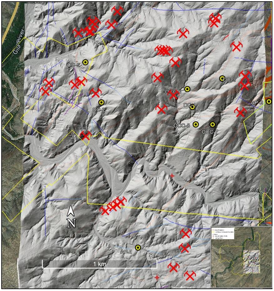 Dr. Gibson stated, “A LiDAR survey over the Hot Breccia property has identified multiple small mines and prospects that were developed along several of the northeast trending structural trends highlighted by intrusion of various typed of dikes. Some polylithic breccias are located along these structural trends as are showings of oxide copper minerals and iron oxide rich shears that commonly show elevated gold in assays.”