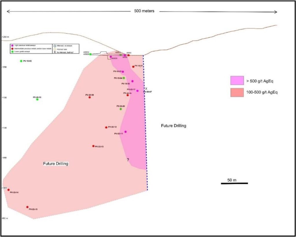 Past drilling on the Palos Verdes vein has shown the presence of a large mineralized shoot. The planned drill program will test the area to the northeast along strike to expand the mineralized body.