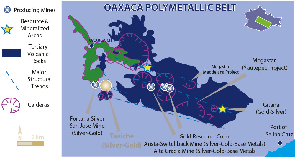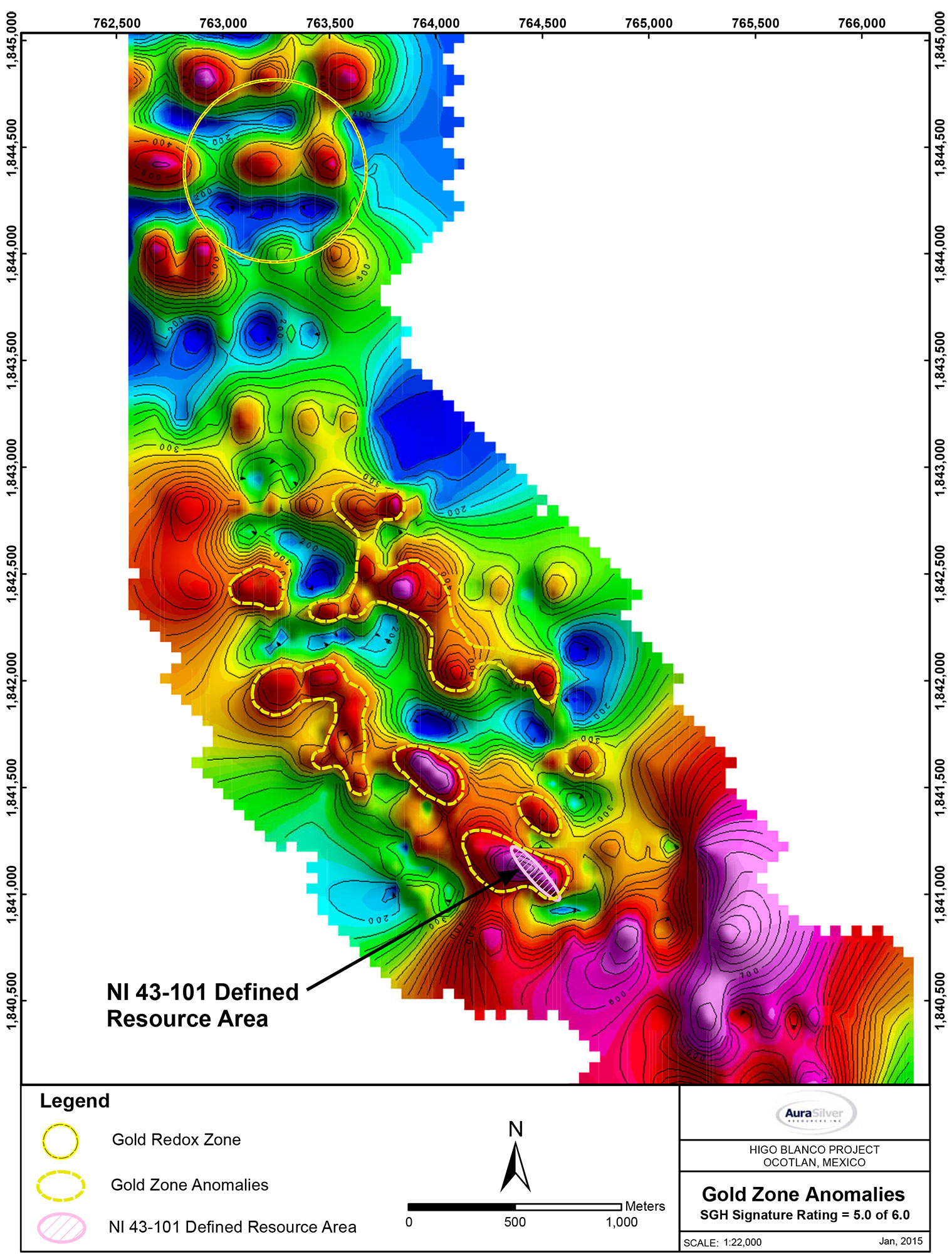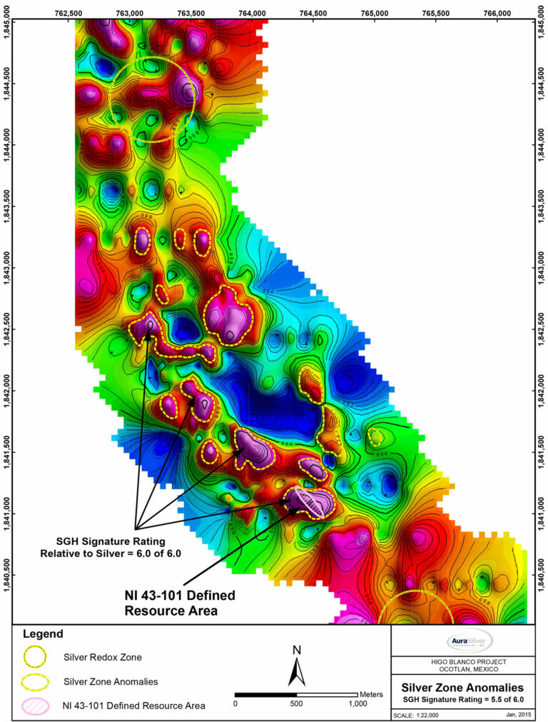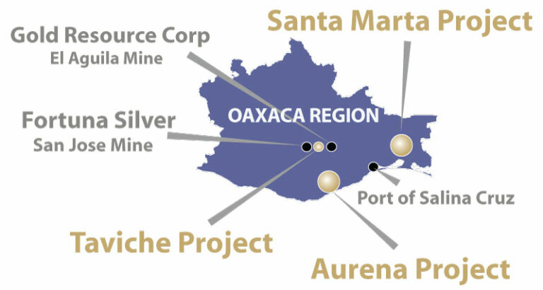 Taviche (100% owned) is an epithermal vein target situated adjacent to Fortuna Silver’s San Jose mine. At the Higo Blanco concession area, a 7 km-long, NW-trending set of veins and vein breccias is emplaced into silicified Cretaceous sediments and Cretaceous-Tertiary volcanic rocks. The silicified limestone breccias contain anomalous gold, silver, arsenic, and antimony. Exposures at Higo Blanco appear to be at high levels of a low sulfidation epithermal vein system. Modern exploration on the Higo Blanco concession has consisted of geological mapping, geochemical surveys (soil, and surface and trench rock samples), ground-based geophysics (magnetics and induced polarization) and a 35-hole, 7,987-m diamond drilling program. Exploration has concentrated on the Higo Blanco jasperoid prospect, a 7 kilometre-long trend of silicified limestones that are variably mineralized at surface with silver minerals with Au potential at depth. Exploration drilling by Aura included two discovery holes at the Higo Blanco prospect which intersected 12.1 m of 533.4 g/t Ag equivalent in hole HBET03-09 and 36.6 m of 303.9 g/t Ag equivalent in HBET16-09. Two step-out holes, HBET28-09 & HBET29-09, were drilled to the northwest of the discovery holes and found wide intervals of Au and Ag mineralization. HBET29-09 cut 122.65 m of 0.16 g/t Au and 23.1 g/t Ag (or 30.9 g/t Ag equivalent), including 57.45 m of 41.1 g/t Ag. HBET28-09, drilled due west from HBET02-09 and 125 m northwest of HBET03-09, contains shorter intervals but with Ag grades of up to 230.0 g/t with the best interval containing 5.8 m of 89.8 g/t Ag.