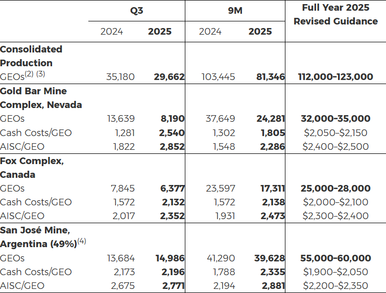 (See Table 1 for Q3 2025 and 9M 2025 production and costs, 2024 comparatives and 2025 revised guidance)