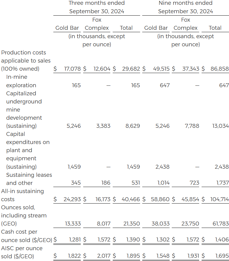 Exploration & Development$6.8M was invested during the quarter in exploration programs at Grey Fox, Gold Bar, Lookout Mountain, and Windfall properties, compared to $5.3M in Q3 2024.