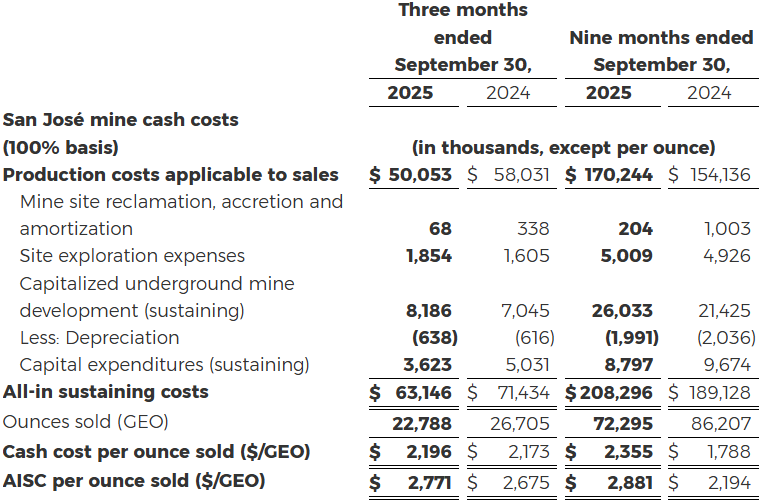 • Despite higher costs, working capital at the San José mine remains strong, reaching $105.7 million (100% basis) as of September 30, 2025.