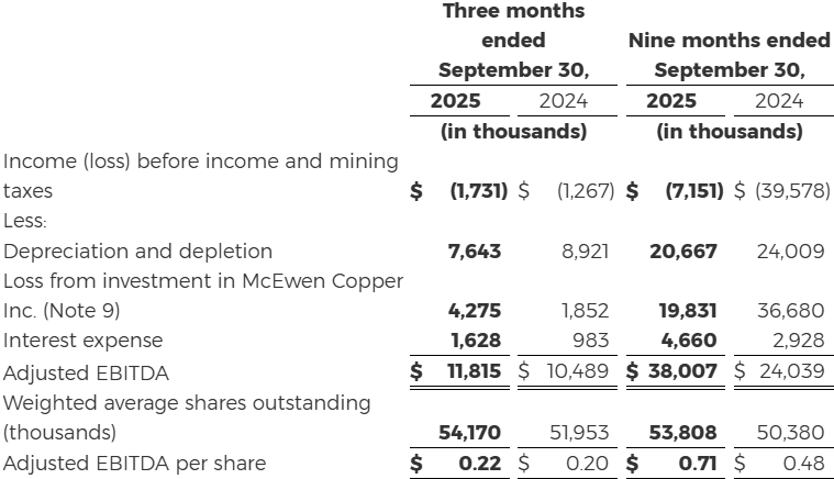 Adjusted EBITDA is calculated by adding back our portion of McEwen Copper’s Q3 results to our consolidated income or loss before income and mining taxes. We use adjusted EBITDA to evaluate our operating performance and ability to generate cash flow from our gold operations in production, including the San José mine.