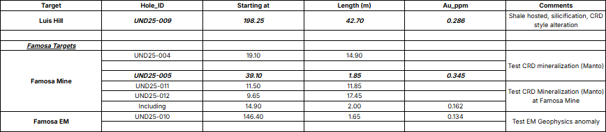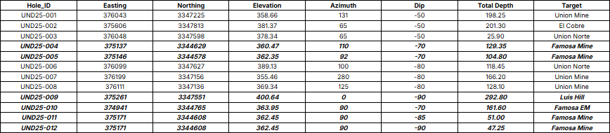 • Program Scale: Completed 12 core holes totaling >1,600 m across six targets: the past-producing Union, Union Norte, and Famosa Mine, as well as Cobre, Luis Hill, and Famosa EM.
