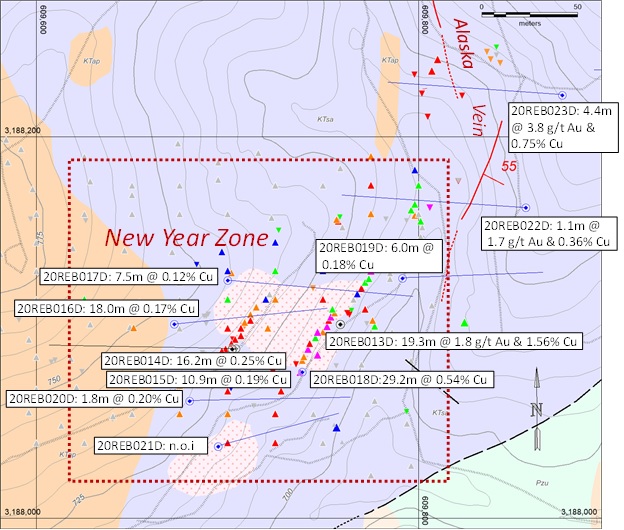Hole 20REB023D, collared approximately 170m Northeast of Hole 20REB013D, was drilled at an angle of -55 degrees and intersected the Alaska Vein returning 3.82 g Au/tonne and 0.75% copper over 4.35m from 70.1m, including 8.61 g Au/tonne and 0.50% copper over 1.55m (Table 1).