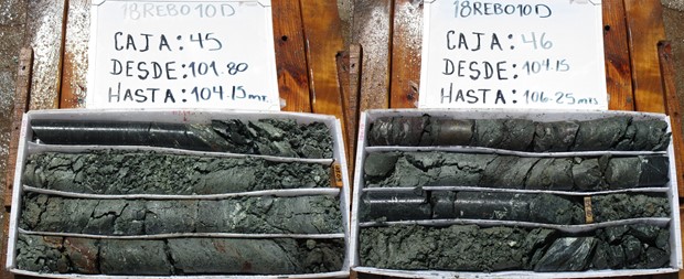 Photo 1.  Drill core from 2018 hole 18REB10 with 36.1 g Au/t and 1.22% Cu in gouge and brecciated andesite at 103.64 to 105.14 meters.
