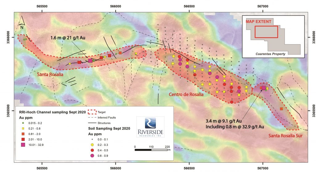 Vancouver, British Columbia–(Newsfile Corp. – October 8, 2020) – Riverside Resources Inc. (TSXV: RRI) (OTCQB: RVSDF) (FSE: R99) (“Riverside” or the “Company”), has received new channel sampling and soil sampling results taken along several of the planned drill targets at The Cuarentas (the “Project”). Results aim to provide respective grade thickness at surface on known targets and to expand the documented strike distance of vein systems through the soil sampling program. The Project is located approximately 20 km to the west of Premier Gold Mines’ Mercedes mine and 30 km south of Agnico Eagle’s Santa Gertrudis operation in Sonora, Mexico. The Cuarentas Project is operated by Riverside with earn-in partner Hochschild Mining (“Hochschild”) funding the next $8,000,000 of investment to reach a 51% interest with additional terms summarized in earlier news (see press release June 24, 2020).