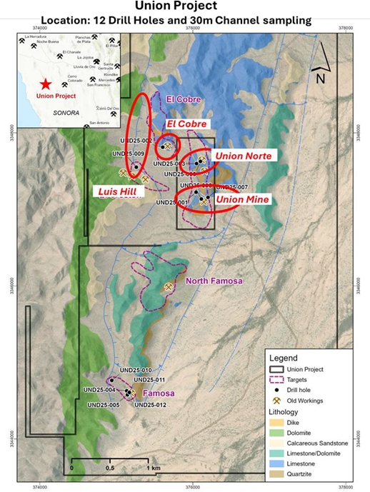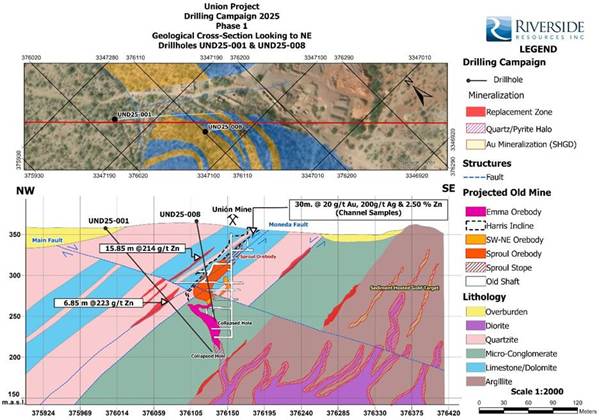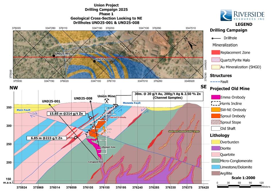 “Riverside is excited by the high grade of 30 meters chip-channel sampling within the oxidized upper part of the Union Mine,” said John-Mark Staude, President and CEO of Riverside Resources. “These results, together with the completed Phase 1 drill assays from Union Mine, Union Norte and El Cobre, reinforce that drilling is intersecting the types of CRD-style alteration and multi-element signatures we were targeting, including anomalous zinc, silver, gold and lead consistent with the historic mining district and also finding sediment-hosted gold (“SHGD”) indicators is a key development in progressing the Union Project and now we are ready for follow-up drilling in 2026.”