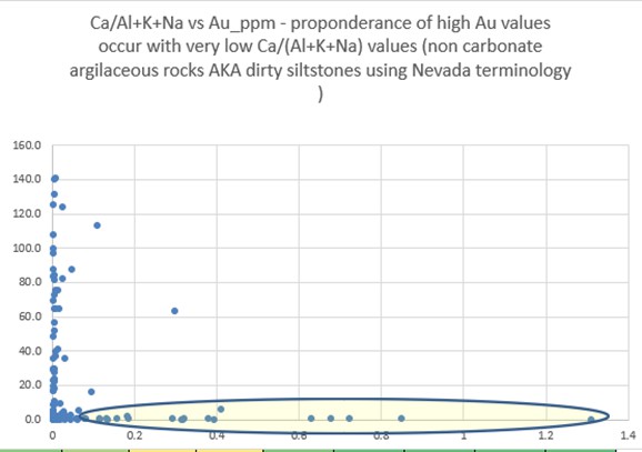 The geochemistry from from the gold intercepts associated with shale horizons at Luis Hill are plotted in (Figure 3 and illustrate the relationship between gold and argillite-hosted horizons. This indicates that Luis Hill is not CRD mineralization; instead, it represents an SHGD-style system: