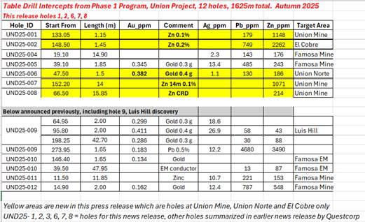 The Phase 1 drill results presented in this table with the focus on holes from the three areas for this news release being the Union Mine 3 holes, 2 holes at Union Norte and 1 at El Cobre shown in yellow. The drill hole 3 is not shown as it was aborted early due to poor drilling conditions and then hole 6 was drilled to test and hit mineralization in the target area initially planned for hole 3. Further drilling at Union Norte can be pursued and is recommended for both CRD and SDHG targets.