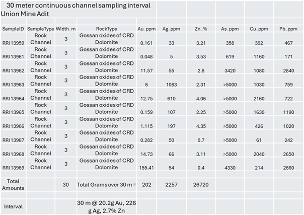 Rock wall chip-channel sampling at the Union Mine returned high grade gold and supports follow-up exploration, with the potential to drill from the upper most mine workings or from surface to expand upon the 30m grading 20 g/t gold zone. Full assay results for the gossan oxide samples are provided in Table 1 below and include high-grade zinc, which is typical of CRD systems in the region. Comparable zinc-rich CRD mineralization occurs at the Hermosa Project with the Taylor Deposit, which US$10B value major mining company South32 is currently advancing in southernmost Arizona near the Sonora border, immediately northeast of the Union Project where South32 is investing US$2.1B in Capex (South32 corporate disclosure, 2025).