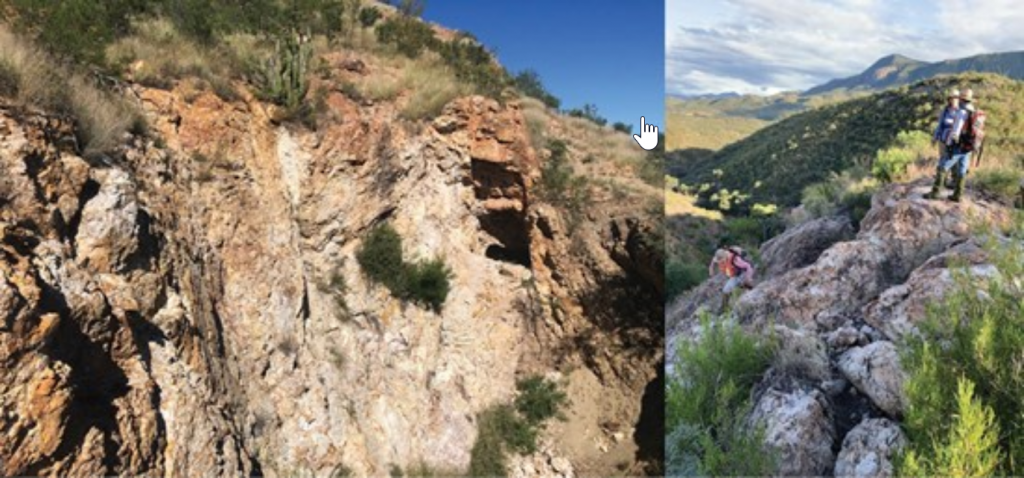 The Santa Rosalia mineralized zone consists of multiple sub-parallel gold-bearing low sulfide quartz veins following an east-west trend called the Santa Rosalia Mine fault. This fault extends for approximately 1 km where gold values are significant and open. Flexure of the Santa Rosalia Mine fault and fault intersections host high-grade gold bearing veins and breccia shoots. Those well-developed structural zones are typically 1 to >3 m in width and as large as 8 metres in width, where Riverside’s sample returned 25.7 g/t Au in vuggy quartz vein and 5.3 g/t Au in the vein-bounded stockwork. The vein material at surface shows evidence of hydrothermal boiling with bladed quartz after calcite.
