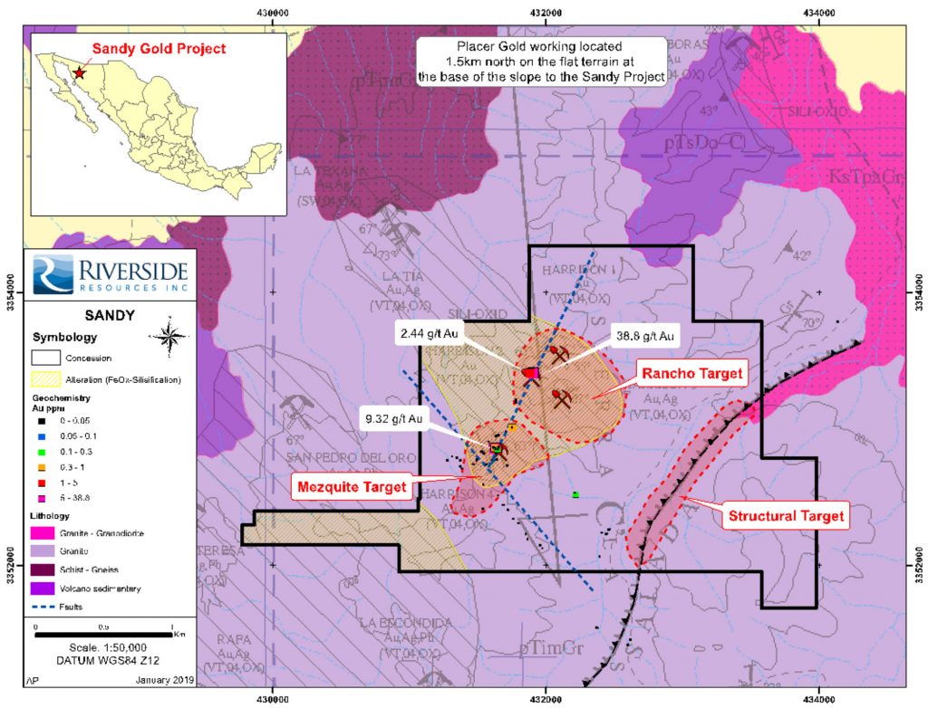 March 21, 2019 – Vancouver, BC: Riverside Resources Inc. (“Riverside” or the “Company”) (TSX-V: RRI) (OTCQB: RVSDF) (FSE: R99), is pleased to report initial results from the Company’s first-phase exploration program at the recently staked Sandy Project (the “Project”) located in northwestern Sonora, Mexico. Riverside continues to leverage its knowledge and experience in NW Mexico to cost-effectively acquire new prospective concessions with strong potential for new discoveries.