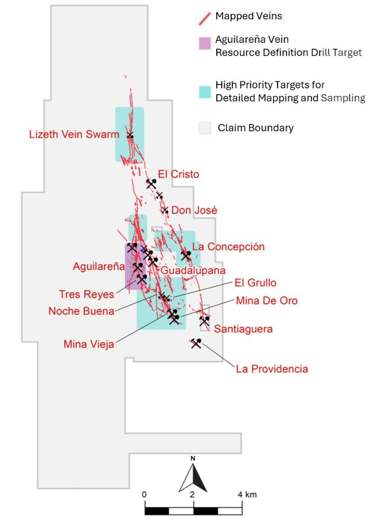The Project encompasses a land package of 11,876 hectares, covering the 9 km by 2.5 km structural vein array (See Figure 1 – Property Overview). The Project includes several previously identified mineralized zones such as Santiaguera, Mina de Oro, Mina Vieja, El Grullo, Noche Buena, Tres Reyes, Aguilareña, Guadalupana, La Concepción, Don Cose, El Cristo, and Lizeth Vein Swarm.