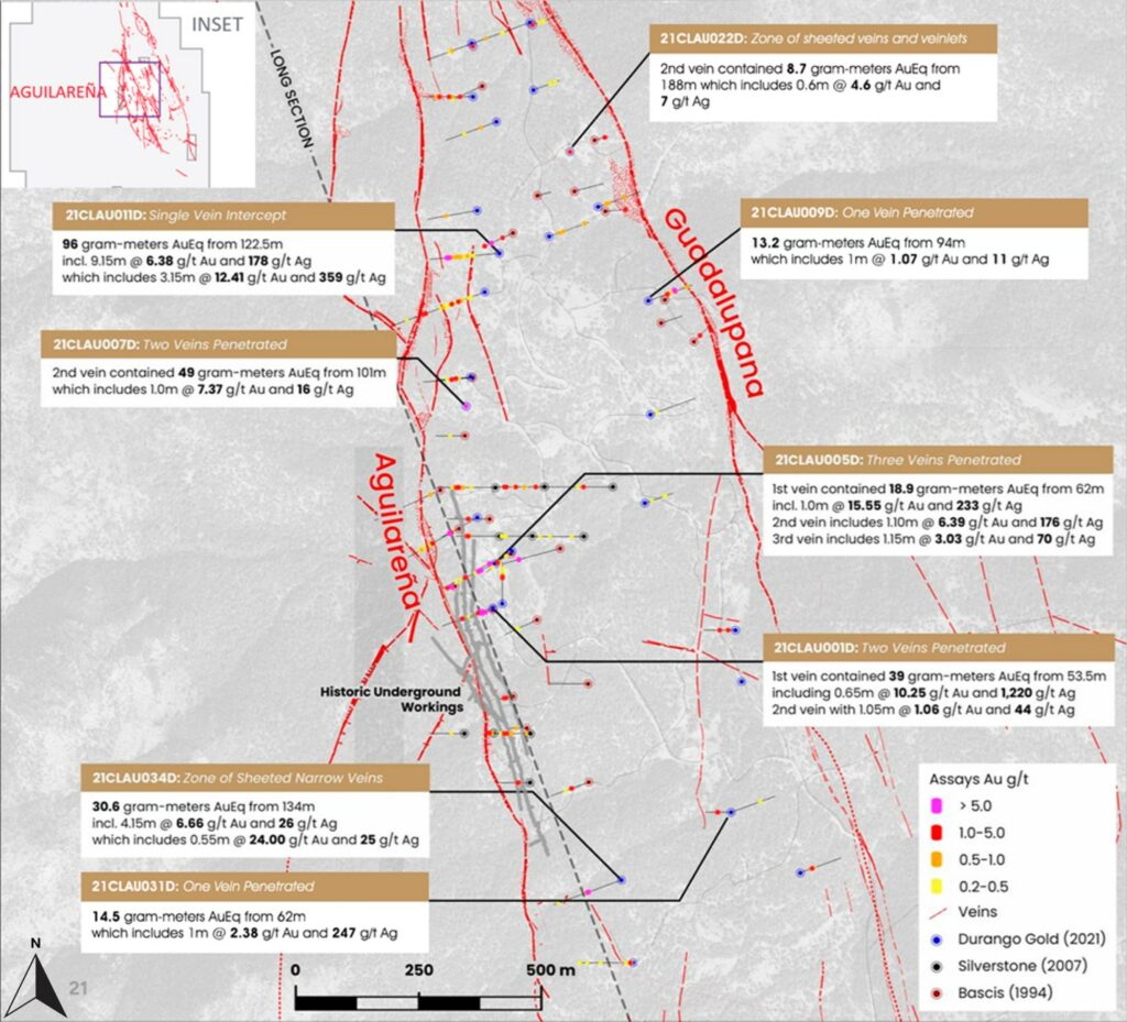 - 21CLAU-001D intersected 22.9 m at 1.69 gpt AuEq (0.94 gpt Au and 60 gpt Ag), including: