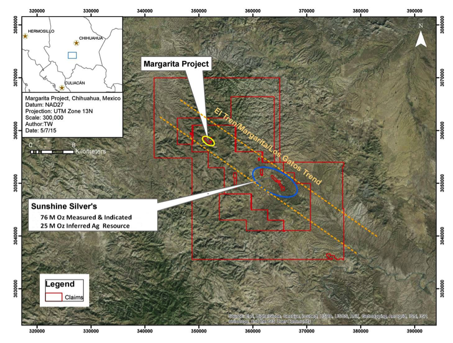 Acquired as part of Sable Resources Upper Level Epithermal Strategy, the Margarita Project is located in the Satevó Municipality in Chihuahua state, approximately 120km SW of the state capital of Chihuahua City, and 110km NNW of the historic Parral mining district. The Project lies on strike with Sunshine Silver Corp.’s Los Gatos Project. Hosted in Eocene-Oligocene Volcanics, Margarita is defined by 4 veins; Margarita, El Caido, Juliana and Maria on 2 claims totally encompassed by Sunshine Silver.