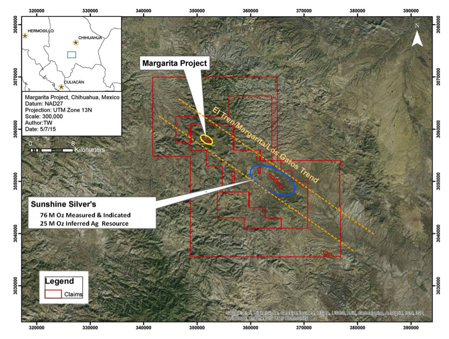 Acquired as part of Sable Resources Upper Level Epithermal Strategy, the Margarita Project is located in the Satevó Municipality in Chihuahua state, approximately 120km SW of the state capital of Chihuahua City, and 110km NNW of the historic Parral mining district. The Project lies on strike with Sunshine Silver Corp.’s Los Gatos Project, which hosts a Measured and Indicated 9.2 million ounce resource containing 178 million ounces silver-equivalent (Sunshine Silver Mining and Refining website published NI 43-101 report titled “Feasibility Study of the Cerro Los Gatos Silver-Lead-Zinc Deposit Los Gatos Project” January 2017). Hosted in Eocene-Oligocene Volcanics, Margarita is defined by 4 veins; Margarita, El Caido, Juliana and Maria on 2 claims totally encompassed by Sunshine Silver.