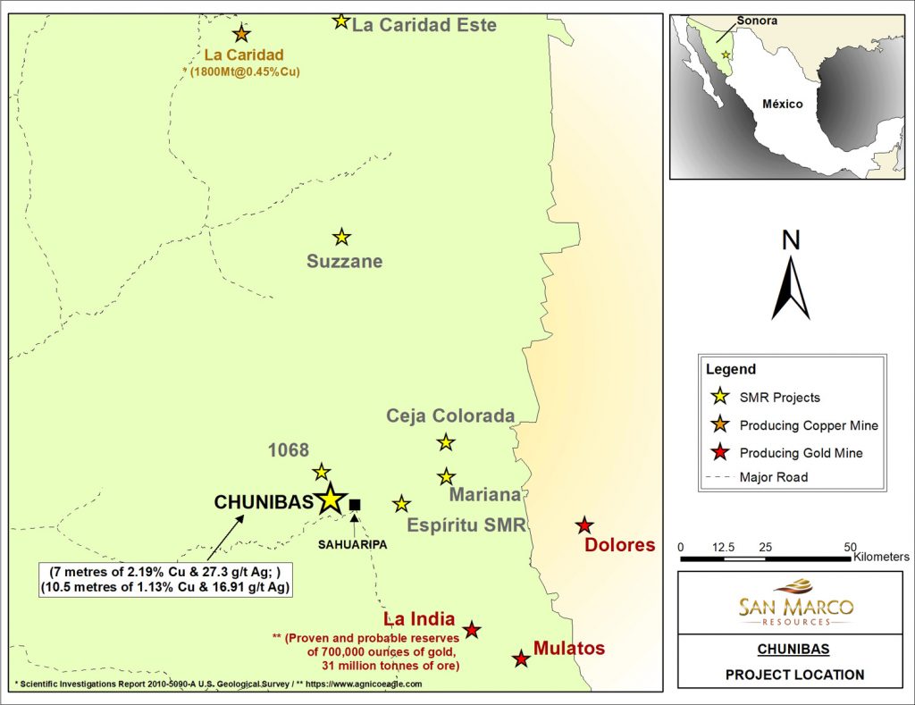 Vancouver, B.C. – November 6, 2018: San Marco Resources Inc. (SMN: TSX-V) (“San Marco” or the “Company”) announces that diamond drilling has commenced at its 100% owned Chunibas copper-silver project, located in Sonora State, Mexico (the “Project”). San Marco and a wholly-owned subsidiary of Antofagasta plc (“Antofagasta”) have entered into an earn-in agreement (the “agreement”) to jointly explore and drill test several copper-silver rich mineralized targets. For further detailed information about the “Agreement”, please see Company´s news release dated August 9th, 2018.