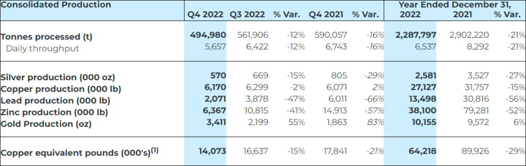 When compared to Q4 2021, a 45% decrease in throughput at Yauricocha, combined with lower head grades for all metals, provided for a 56% decrease in copper equivalent pounds produced. Yauricocha’s annual throughput was 1,053,980 tonnes, representing a 16% decrease when compared to the 2021 annual production.
