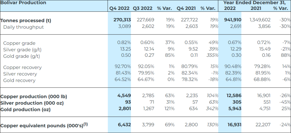 • Bolivar’s improved operating performance resulted in a 69% and 130% increase in copper equivalent production over Q3 2022 and Q4 2021, respectively.