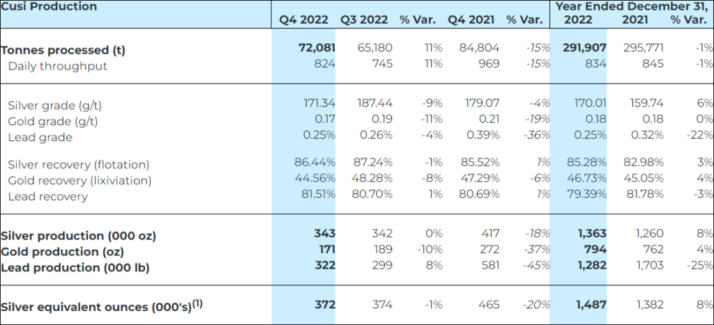 The Cusi Mine processed 72,081 tonnes of ore during Q4 2022, representing an 11% increase over the previous quarter as mining resumed in the area where flooding occurred earlier in the year. The increased throughput helped offset the impact of lower grades and a lower silver and gold recovery rate during the quarter. Silver production remained flat when compared to Q3 2022 with a 1% decline in silver equivalent production.