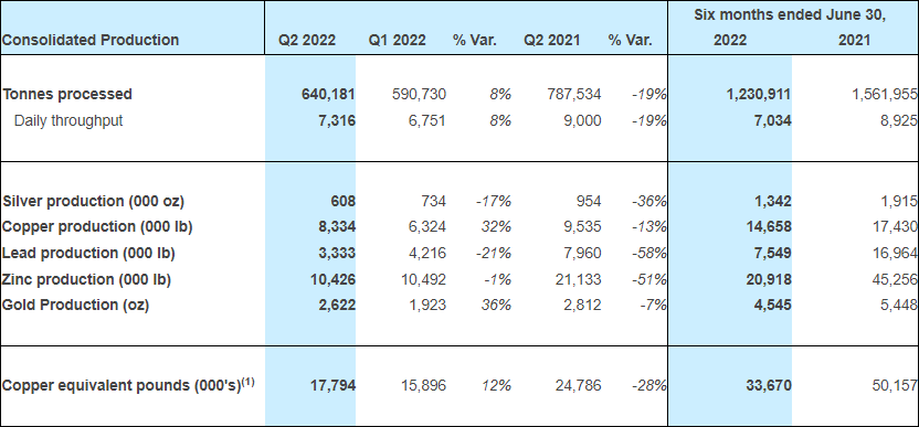 When comparing Q2 2022 to Q2 2021, the mine processed 9% fewer tonnes of ore. Silver production decreased 4% to 0.3 million ounces, gold production increased 13% to 160 ounces and lead production increased 112% to 0.3 million pounds. Silver equivalent production of 283,000 ounces for the quarter was in line with Q2 2021.