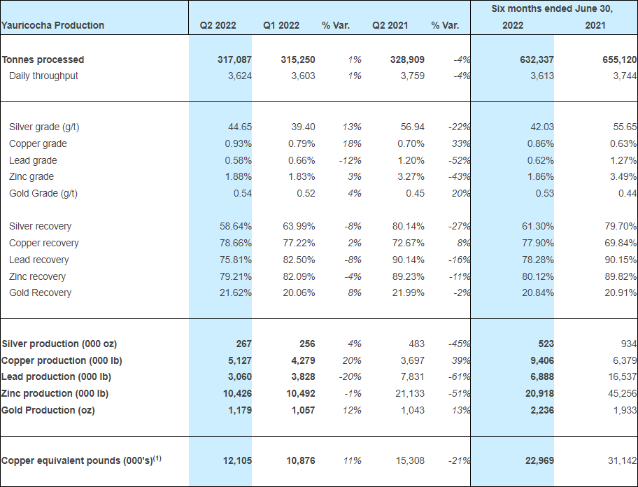 The Yauricocha Mine processed 317,087 tonnes during Q2 2022, which was in line with throughput in Q1 2022. However, we note an improvement when compared to Q1 2022 copper equivalent pound production, with an 11% increase to 12.1 million pounds due to improved grades in all metals with the exception of lead.