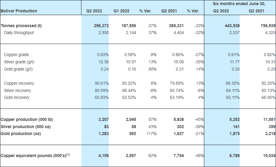 The Bolivar mine processed 256,372 tonnes in Q2 2022, compared to 187,556 tonnes in Q1 2022, which was a 37% increase. Higher production as well as higher grades in all metals resulted in a 62% increase in copper equivalent pound production.
