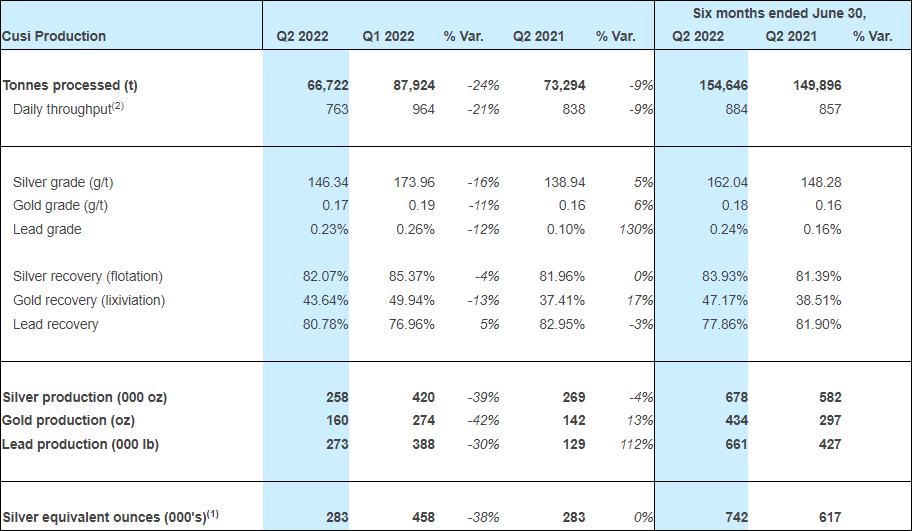 At Cusi, throughput was 66,722 tonnes during Q2 2022 or 21% lower as compared to Q1 2022. Lower throughput and lower grades resulted in a 38% decrease in silver equivalent production. When comparing Q2 2022 to Q2 2021, silver equivalent production remained flat due to higher head grades for all metals, despite a 9% decrease in throughput.
