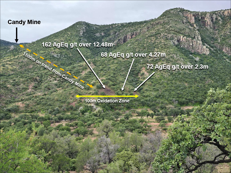 The new North Canyon Zone is 1,500m north, and along strike from the historic Candy mine, and 950m north of previously reported surface sampling that returned up to 29.61 g/t gold, 2,215 g/t silver and 3.34% copper