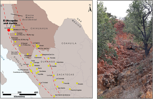 Silver Spruce’s El Mezquite and Jackie Projects are located within the western portion of the Sierra Madre Occidental Volcanic Complex within the prominent northwest-trending “Sonora Gold Belt” of northern Mexico and parallel to the precious metals-rich Mojave-Sonora Megashear.