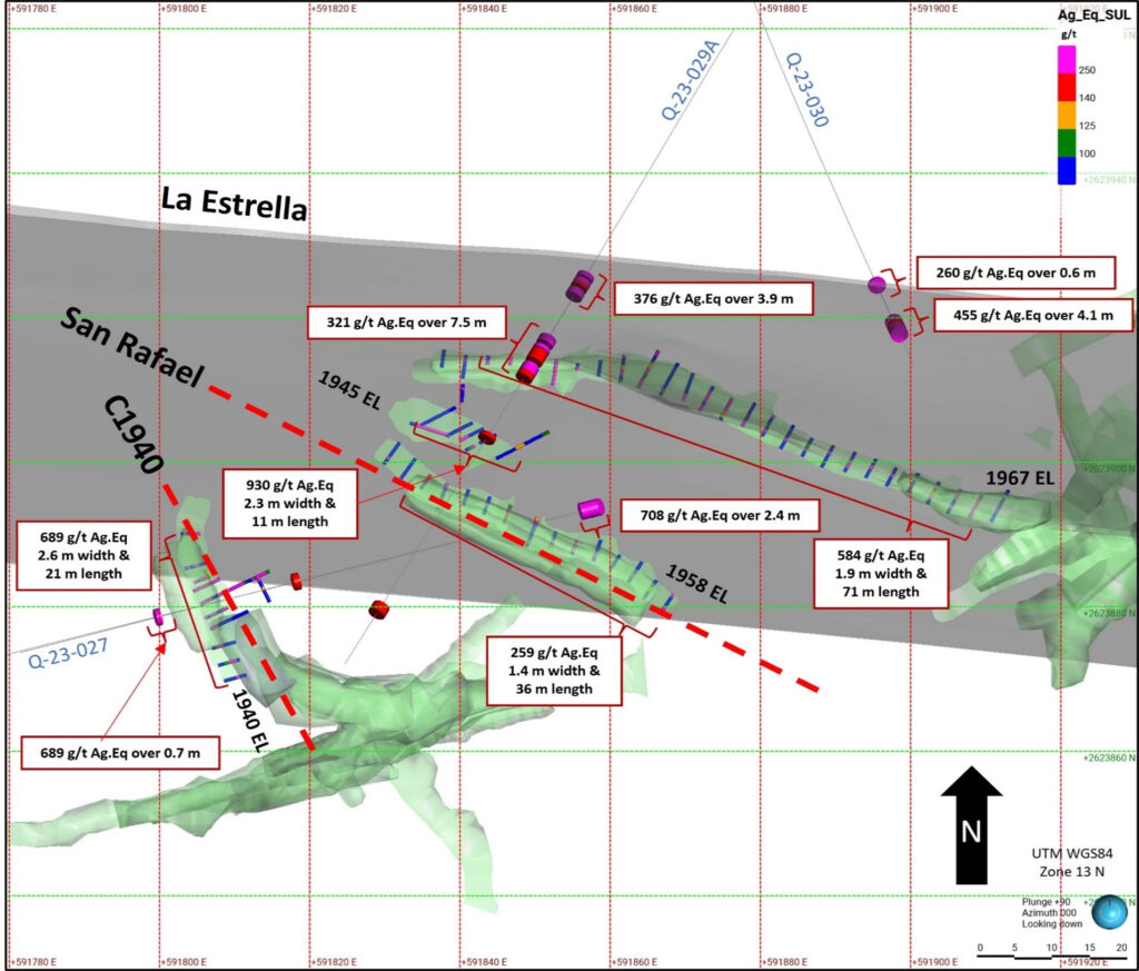 - Hole Q-23-027 intersected the San Rafael Zone returning 708 g/t Ag.Eq over 2.36 m, including 1,673 g/t Ag.Eq over 0.57 m.