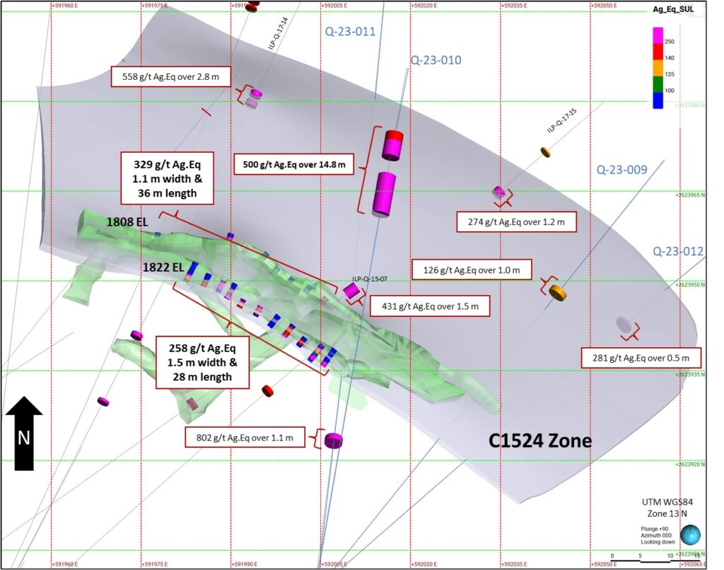 • Holes Q-23-012 & Q-23-009 intersected the C1524 Zone returning 281 g/t Ag.Eq over 0.45 m & 126 g/t Ag.Eq over 1.00 m respectively.