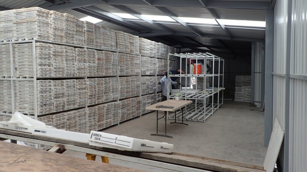 The diamond drill core (HQ size) is geologically logged, photographed and marked for sampling. When the sample lengths are determined, the full core is sawn with a diamond blade core saw with one half of the core being bagged and tagged for assay. The remaining half portion is returned to the core trays for storage and/or for metallurgical test work.